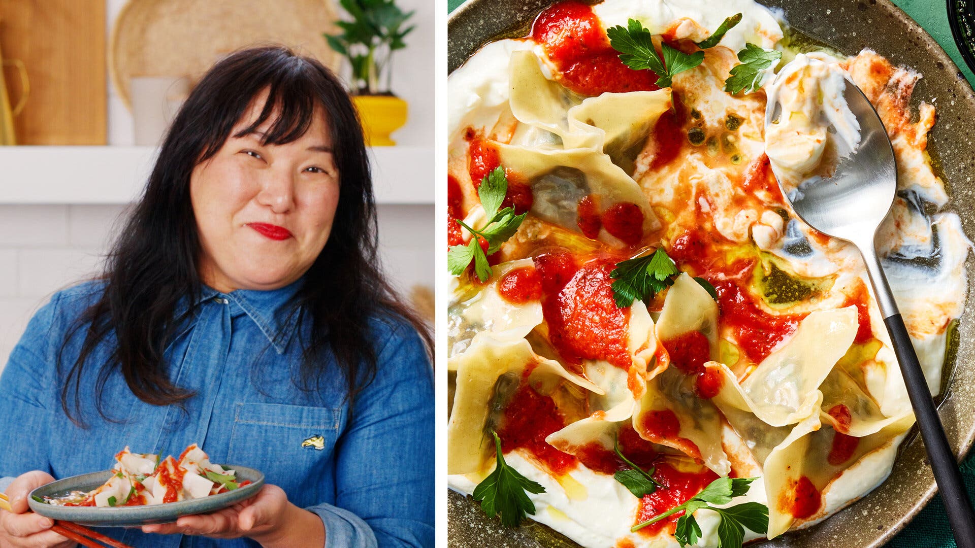 Kay Chun’s mom’s cabbage-potato soup and other similar dishes, like pierogi and knishes, inspired these dumplings. The savory filling combines creamy mashed potatoes and caramelized cabbage, seasoned with tangy sauerkraut, fragrant caraway, Parmesan and fresh dill. These dumplings are equally delicious boiled and tender or pan-fried and crisp. Leftovers can be cooked with vegetables in broth for a quick, satisfying soup.