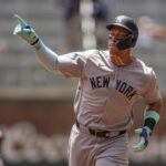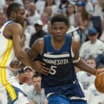 May 14, 2025; Las Vegas, Nevada, USA; Edmonton Oilers right wing Kasperi Kapanen (42) digs the puck out from under the skate of Vegas Golden Knights goaltender Adin Hill (33) to score a game-winning goal in overtime to give the Oilers a 1-0 victory in the game and a 4-1 series win during game five…