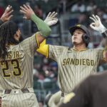 May 22, 2025; Bronx, New York, USA; New York Yankees starting pitcher Carlos Rodon (55) slaps hands with catcher J.C. Escarra (25)after the top of the sixth inning against the Texas Rangers at Yankee Stadium. Mandatory Credit: Vincent Carchietta-Imagn Images Carlos Rodon earned his fifth straight win by pitching six solid innings as the host…