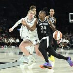 May 22, 2025; Chicago, Illinois, USA; New York Liberty guard Sabrina Ionescu (20) drives to the basket against Chicago Sky guard Ariel Atkins (7) during the first half at Wintrust Arena. Mandatory Credit: Kamil Krzaczynski-Imagn Images Natasha Cloud and Kennedy Burke each hit four of New York’s WNBA-record 19 3-pointers and combined for 35 points…